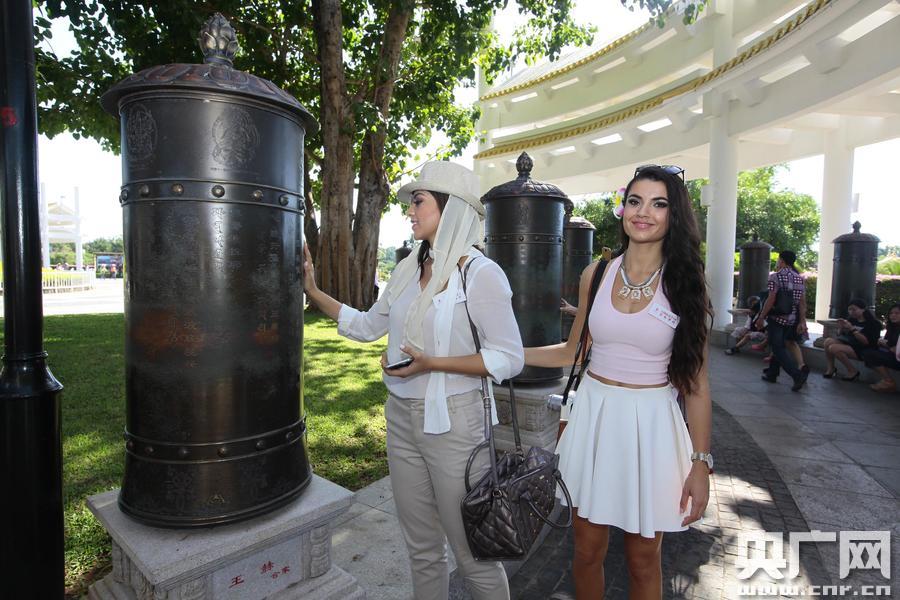 在海上觀音廣場,佳麗對中國佛教和觀音文化十分好奇和神往,對108米海上觀音像嘆為觀止。在海上觀音廣場和南山寺,不少佳麗還紛紛雙手合十祈福,中國小姐袁璐還親自示范禮佛的動作。