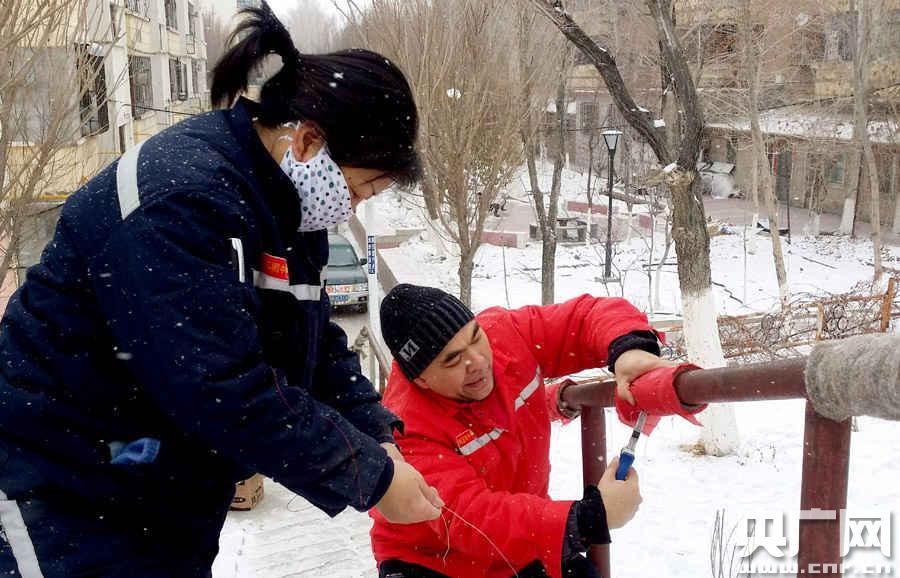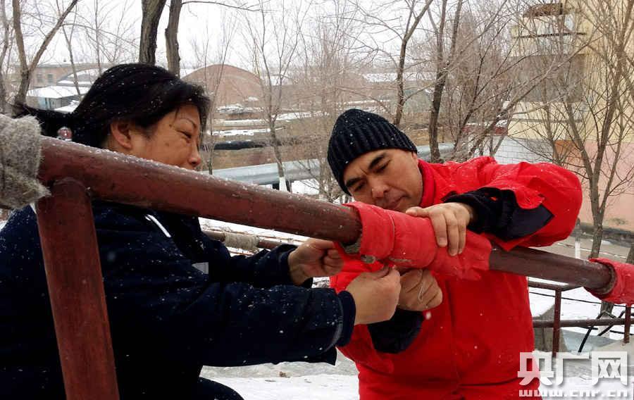 克拉瑪伊白堿灘物業(yè)管理公司員工冒著雪花給扶梯安裝“暖手寶”(周建玲攝)