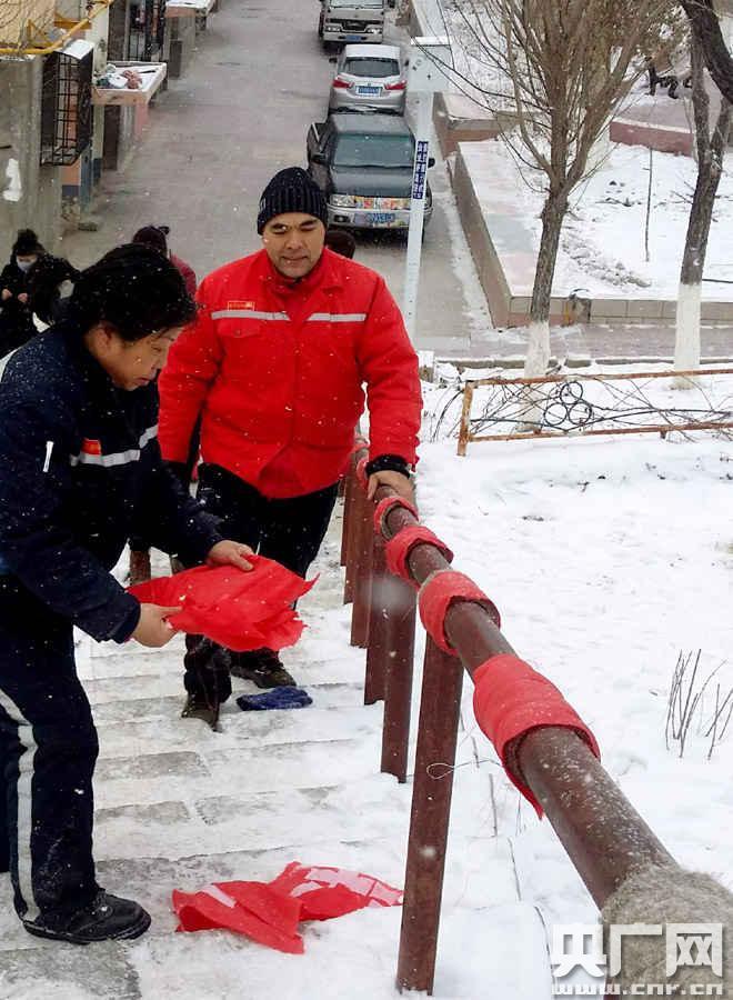 央廣網(wǎng)克拉瑪依1月6日消息(記者張雷 通訊員周建玲 劉曉群)歲末年初,新疆克拉瑪依市中石油新疆油田公司白堿灘物業(yè)管理公司開展“愛暖寒冬,溫暖你身”關(guān)愛小區(qū)居民出行溫暖行動,員工們?yōu)槁愤叿鍪职厦珰、地毯等“暖手寶”,避免行動不便的市民冬季出行接觸扶手時手掌收到冰凍,并清除進出小區(qū)路口坡道冰雪,方便小區(qū)居民安全出入。