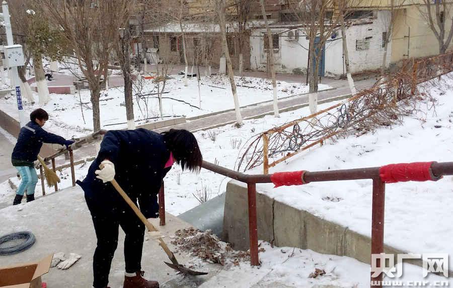 克拉瑪伊白堿灘物業(yè)管理公司員工冒著雪花清理階梯冰雪(周建玲攝)