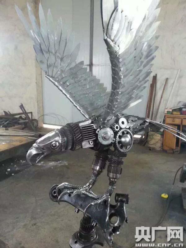 眼下,喜迎十三冬,除了微雕,三兄弟還趕制了一只鐵雕鷹。為了達(dá)到最佳效果,三兄弟來(lái)回拆了不下十次。陳海軍說(shuō):“你看腿呀,還有這個(gè)尾巴后面,就是挑各種齒輪,組合起來(lái),這沒(méi)有圖紙,然后就是看著零件,零件大概大小呀,形狀呀,就是適合這個(gè)鷹的,放在哪個(gè)部位,這個(gè)翅膀做了三天吧,羽毛總共大概有200片了吧!