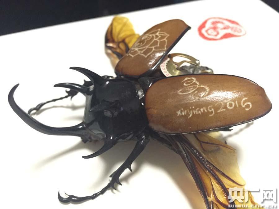 馬馳使用的蟲(chóng)子標(biāo)本是來(lái)自泰國(guó)的兜蟲(chóng),就是咱平常熟悉的金龜子。由于翅膀上有一層蠟質(zhì)油跡,不僅表面光滑,字墨也難以沁入。他說(shuō):“它在轉(zhuǎn)動(dòng)起來(lái)的時(shí)候,特別容易滑動(dòng)到其他的位置,所以手一定要特別的穩(wěn)。”