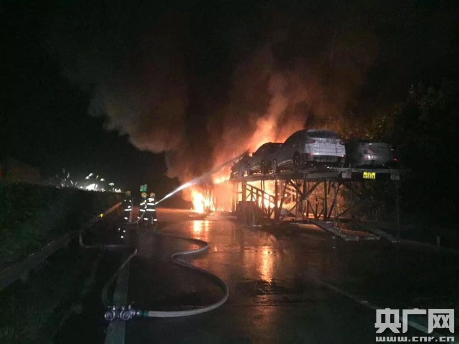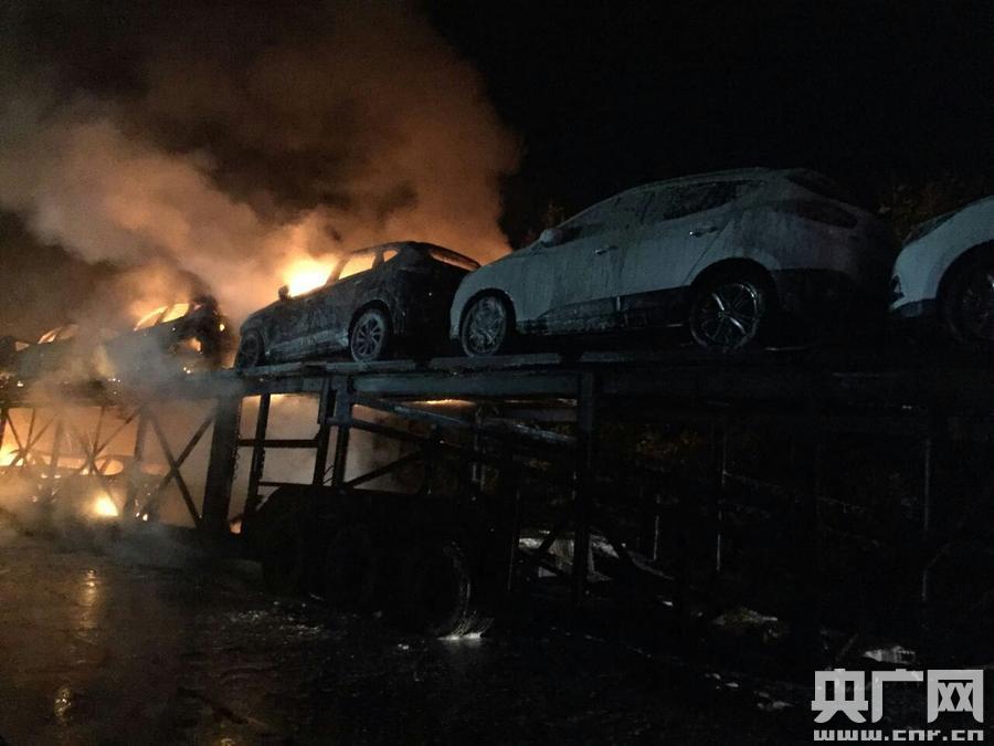 央廣網(wǎng)南寧1月26日消息(記者 張壘 許大為 通訊員 鐘德林)1月25日20時許,G80線廣昆高速公路岑溪段發(fā)生一起重型掛車行駛中起火,導(dǎo)致所運載的13輛小汽車燒毀,無人員傷亡,交通暫時中斷,當?shù)叵、交警到場處置?/p>