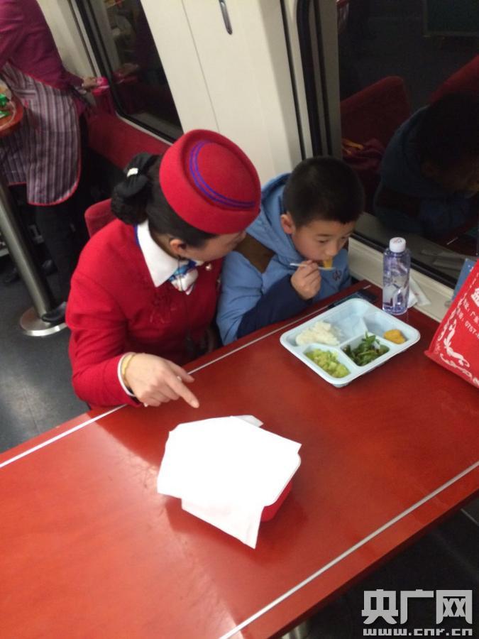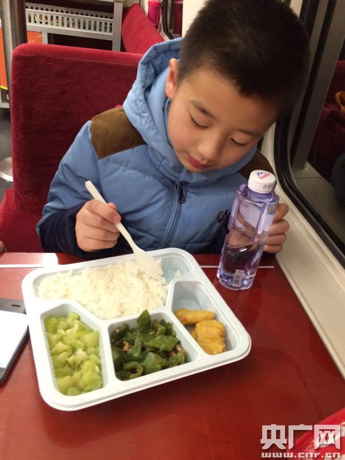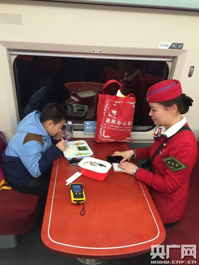 得知小男孩是獨(dú)自乘車之后,喻榮一邊安慰小男孩一邊呼叫列車長李婷趕來。此時(shí)列車在桂林站剛開車不就,已是晚上6點(diǎn)40分,李婷趕到后看到小男孩饑腸轆轆的樣子,既心酸又心疼。她和喻榮一起將小男孩和行李帶到餐車進(jìn)行安置,同時(shí)將自己的乘務(wù)餐拿出來讓小孩先吃,看著小男孩狼吞虎咽的樣子,李婷的臉上浮現(xiàn)出了開心的笑容。吃過飯后,李婷和小男孩聊起了天,得知小男孩名叫姚熙程,父母都在桂林打工,姐姐在武漢上班,從小到大幾乎沒有出去旅過游。今年寒假來臨,爸爸特地將他送上了到武漢的高鐵,讓姐姐帶他見識下武漢的美麗風(fēng)光,上車前在超市買了一份他喜歡吃的盒飯,沒成想一掀開米飯都發(fā)了霉,茫然無措的他這才找到乘務(wù)員尋求幫助。說到這里,小熙程的心情又低落了下來。