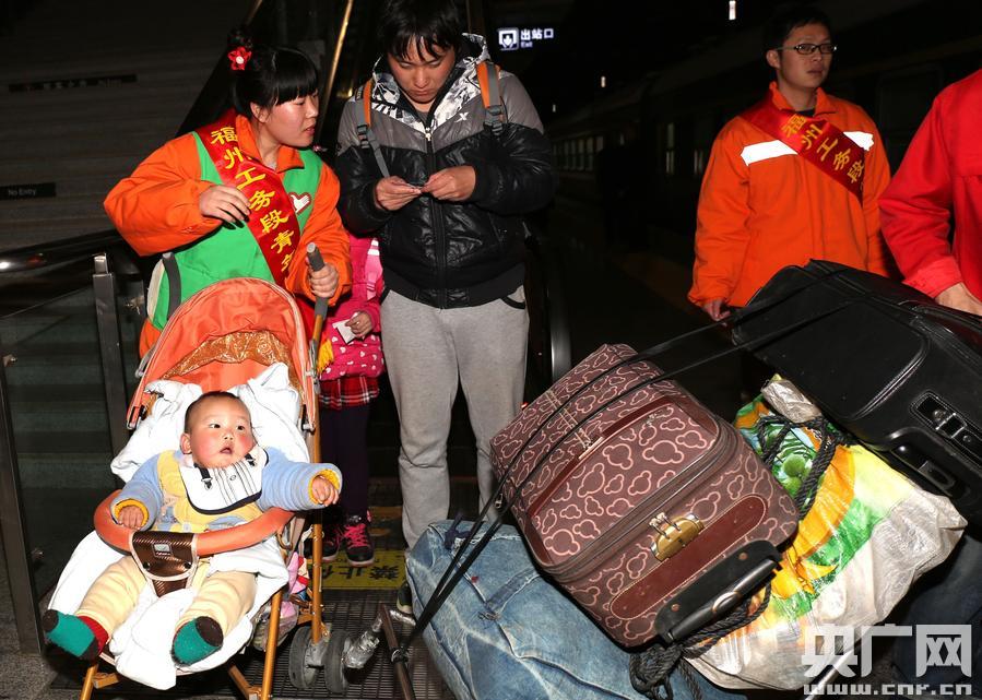 央廣網(wǎng)福州1月27日消息(記者 葛朝興 通訊員 雍萬俊 許建勝 )“他們就像閃爍著火焰的桔燈溫暖著我們的回鄉(xiāng)路”。1月26日晚8時,福州開往達(dá)州K4382次列車?吭诟V莼疖囌1號站臺,當(dāng)進(jìn)站的閘門拉開,乘車的旅客如同滾滾洪流奔騰著,在奔騰的洪流中有群身穿桔黃色防護(hù)服務(wù)身披綬帶的青年在人群中來回穿梭著,他們或是幫助重點(diǎn)旅客扛行李或是幫助旅客照顧孩子,讓歸心似箭的旅客在極寒的返鄉(xiāng)途中多了幾分溫暖,他們就是南昌鐵路局福州工務(wù)段黨團(tuán)員志愿者服務(wù)隊的青年。