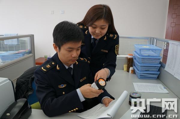 天津檢驗(yàn)檢疫局北疆辦事處工作人員對(duì)進(jìn)口蜂蜜進(jìn)行標(biāo)簽審核