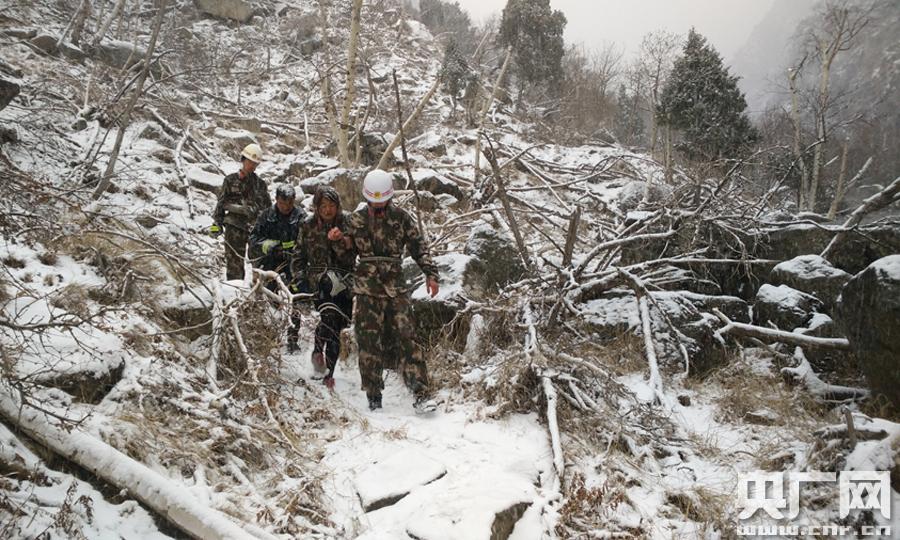 晚上10時多消防官兵抵達滾鐘口賀蘭石礦山腳下,通過詢問得知,被困人員位置較遠,山路崎嶇。由兩名景區(qū)巡山人員領路,救援官兵深入山中進行救援,并分成兩組進行找尋。但由于深夜無法確定被困人員位置, 今日凌晨,7名救援官兵攜帶救援器材再次與巡山人員進山救援。上午11時確定被困者位置,12時找到了被困十多個小時的兩名被困人員。在下山的途中突然下起了大雪,山路被雪覆蓋,在利用安全繩互相牽引下試探一點一點往山下撤離。經(jīng)過連續(xù)8個多小時的艱苦救援,下午2時40分,兩名被困人員被成功救下山,身體并無大礙。