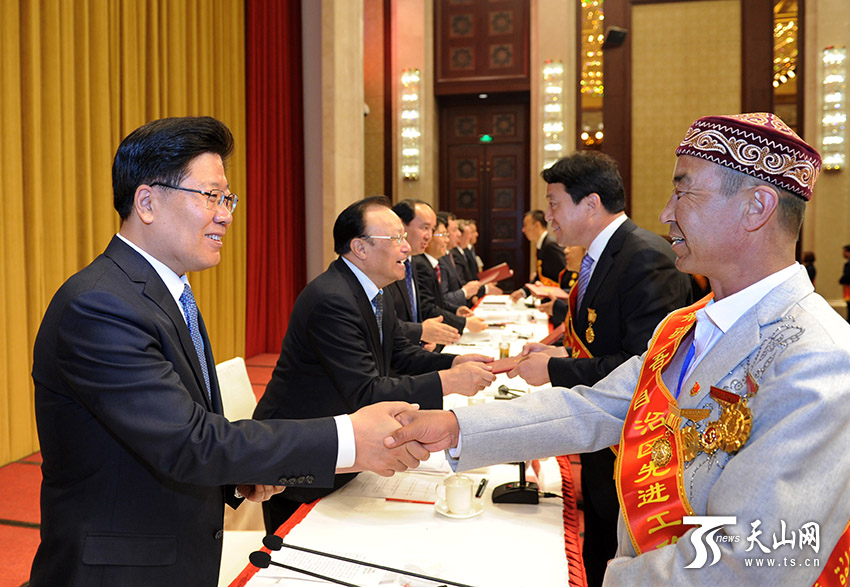 中共中央政治局委員、新疆維吾爾自治區(qū)黨委書(shū)記張春賢為2016年先進(jìn)工作者居馬泰·俄白克頒發(fā)榮譽(yù)證書(shū)