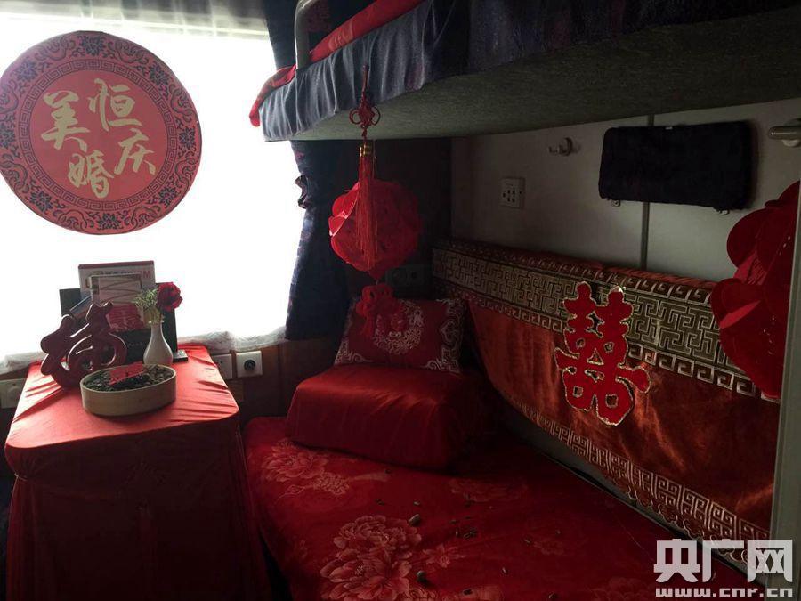 “我們在微信上看見前段日子這趟車上舉辦過婚禮,覺得這樣的婚禮挺個(gè)性、挺有紀(jì)念意義的,我們就商量在‘5·20’這個(gè)特別的日子里用特別的方式來記錄我們的青春!闭劶霸诹熊嚿吓e行婚禮,看著用列車包房裝扮得古色古香的婚房,新郎小張掀起了新娘的紅蓋頭。