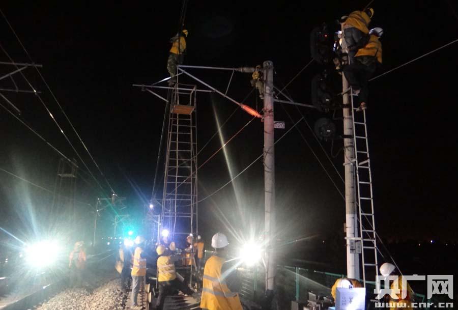 中國(guó)鐵建電氣化局集團(tuán)一公司工程技術(shù)人員在凌晨進(jìn)行接觸網(wǎng)施工作業(yè)(王生政 攝)