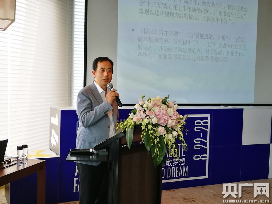 廣東省服裝服飾行業(yè)協(xié)會(huì)劉岳屏執(zhí)行會(huì)長在2016廣東時(shí)尚高峰論壇上發(fā)布了《廣東服裝行業(yè)“十三五”發(fā)展規(guī)劃綱要》(央廣網(wǎng)記者 何偉奇 攝)