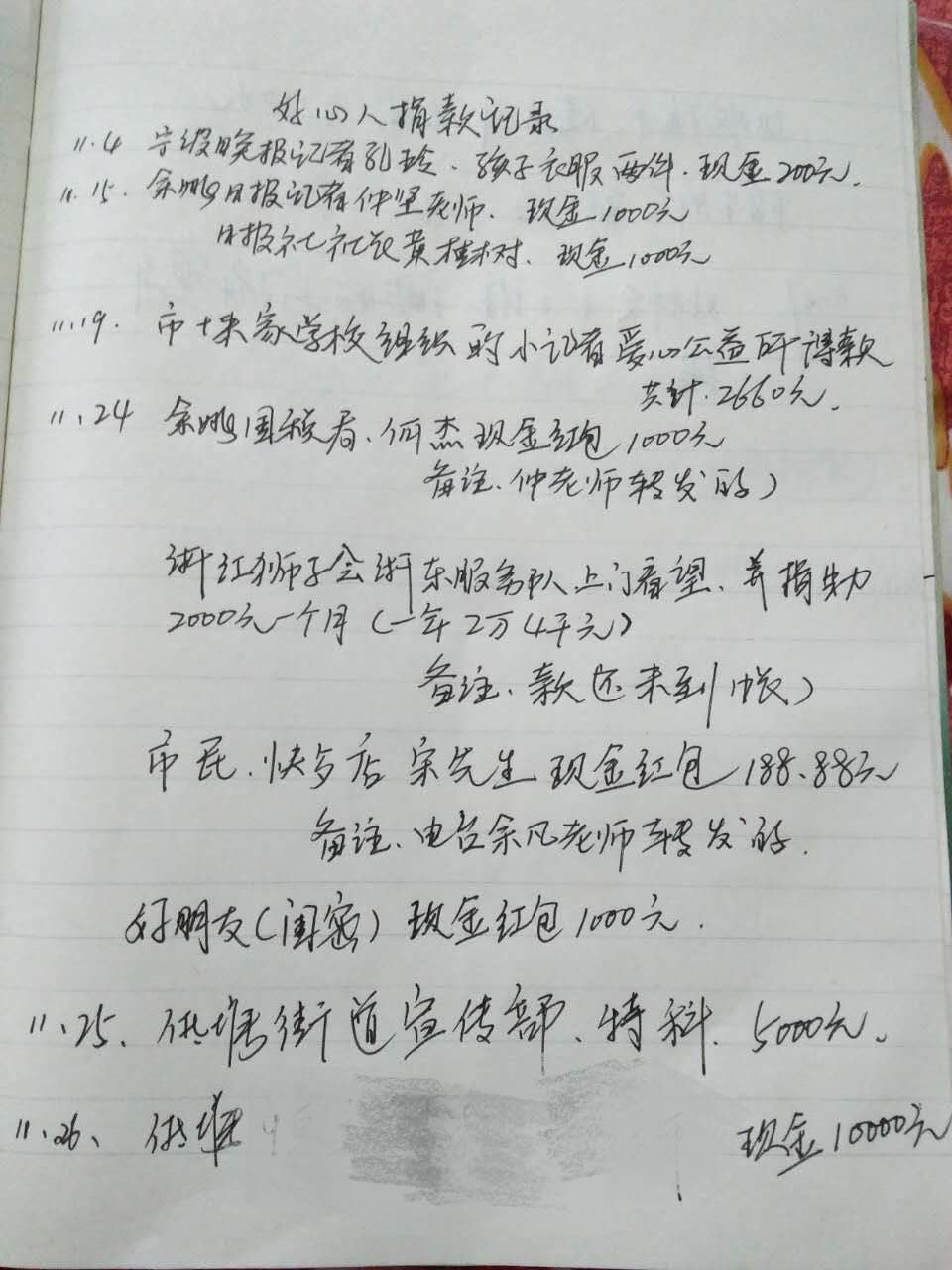 “這幾天,我真的被太多好心人感動(dòng)了。”韓亞麗拿出一本好心人捐款記錄,上面密密麻麻記著從11月4號(hào)以來(lái),好心人給她捐的款項(xiàng),字寫得清秀工整。“我動(dòng)手術(shù)的時(shí)候,是我最困難的時(shí)候。但我一直沒(méi)有想過(guò)求助于社會(huì),我不想給社會(huì)添麻煩!表n亞麗反反復(fù)復(fù)說(shuō)著這樣一句話。