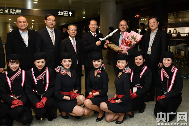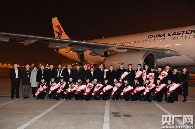 東航領(lǐng)導(dǎo)在虹橋機場迎接機組,共同慶祝實現(xiàn)2016航空安全年