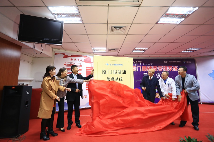 廈門市衛(wèi)生計(jì)生委副主任洪豐穎(右三)等嘉賓共同啟動(dòng)“廈門市眼健康管理系統(tǒng)”