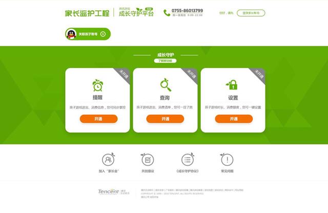 隨著互聯(lián)網(wǎng)行業(yè)的高速發(fā)展,更多的低齡兒童加入到網(wǎng)絡(luò)大軍。網(wǎng)絡(luò)對(duì)未成年人的身心發(fā)展影響也是越來(lái)越大。為了完善對(duì)未成年人使用網(wǎng)絡(luò)游戲服務(wù)的監(jiān)護(hù)力度,在文化部“網(wǎng)絡(luò)游戲未成年家長(zhǎng)監(jiān)護(hù)體系”號(hào)召下,騰訊公司于2016年下半年開(kāi)始籌備“騰訊游戲成長(zhǎng)守護(hù)平臺(tái)”,經(jīng)過(guò)數(shù)個(gè)月的開(kāi)發(fā)與測(cè)試,并持續(xù)邀請(qǐng)家長(zhǎng)與未成年子女共同參與設(shè)計(jì)、體驗(yàn)并進(jìn)行平臺(tái)優(yōu)化。目前,平臺(tái)推出的主要服務(wù)功能包括:實(shí)名認(rèn)證并綁定未成年人游戲賬號(hào)、子女登錄游戲及消費(fèi)實(shí)時(shí)提醒、消費(fèi)額度設(shè)置、游戲登錄時(shí)段設(shè)置、以及一鍵禁止游戲等需要家長(zhǎng)與子女共同配合的監(jiān)護(hù)功能。