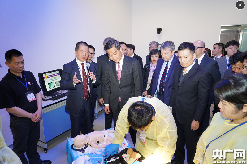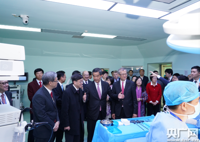 活動儀式后,梁振英在吳以環(huán)副市長和廣東省港澳辦公室主任廖京山陪同下參加了醫(yī)院,并仔細(xì)觀摩了在臨床技能模擬培訓(xùn)中心開展的高級創(chuàng)傷生命支持(ATLS@)訓(xùn)練課程、中醫(yī)針灸推拿治療應(yīng)用中草藥配合針灸、推拿、拔罐、艾灸等傳統(tǒng)治療方法治療等過程,并參觀了醫(yī)院藥房自動配藥裝置和藥品管理系統(tǒng)、醫(yī)院手術(shù)室二區(qū)達(dá)芬奇機(jī)器人手術(shù)間和兒科病區(qū)。他對港大深圳醫(yī)院優(yōu)美的環(huán)境和先進(jìn)設(shè)施表示贊賞,稱贊醫(yī)療服務(wù)和管理“達(dá)到國際化水平”。