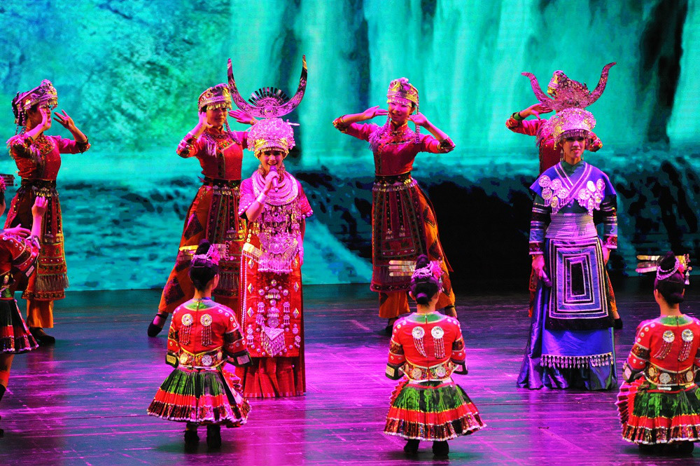 隨著奔放歡快的音樂,苗族姑娘跳起了有著“東方迪斯科”之稱的踩鼓舞。她們身上的銀飾閃爍著炫目的光芒,一身五顏六色的盛裝有如怒放爛漫的山花,在舞臺上綻放開來,臺下的觀眾也不由鼓起掌來……