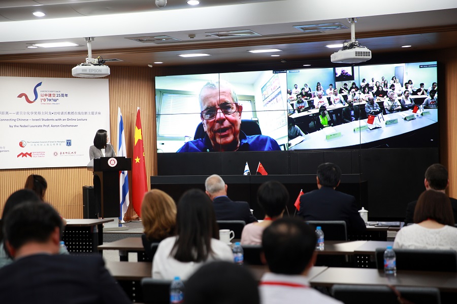 為契合“中以建交二十五周年”主題,以色列駐上?傤I(lǐng)事館邀請到以色列諾貝爾化學(xué)獎(jiǎng)得主Aaron Ciechanover教授為中以學(xué)子做歷時(shí)二十五分鐘的在線創(chuàng)新主題講座。華東師大與海法大學(xué)各二十五名學(xué)生跨越五個(gè)時(shí)區(qū)在各自的校園聆聽了大師的演講。