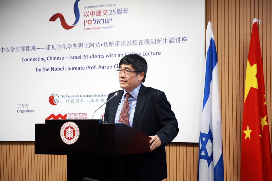 央廣網(wǎng)上海5月24日消息(記者傅聞捷)為紀(jì)念中以建交二十五周年,“中以學(xué)生零距離——諾貝爾化學(xué)獎(jiǎng)得主阿龍·切哈諾沃教授在線創(chuàng)新主題講座”昨天在華東師范大學(xué)舉行。本次活動(dòng)由華東師范大學(xué)、以色列駐上?傤I(lǐng)事館和以色列海法大學(xué)聯(lián)合舉辦。