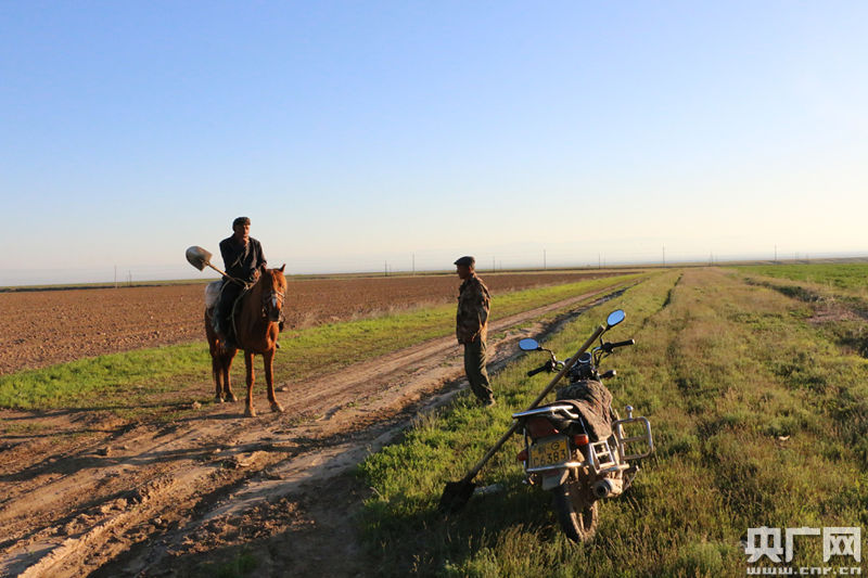 兩小時后,水坑里水不多了,阿黑收拾工具回家。路上碰見同村農民吉格斯夾著鐵锨騎著馬來澆水,吉格斯請阿黑下午幫忙撒化肥、種苜蓿。說是幫其實也收錢,不過阿黑好說話,村民啥時有錢啥時結賬。正因為這,他似乎總有活干。阿黑說,辛苦點一天多掙一兩百,一年就能多掙幾萬,生活怎么能不好呢。說這話時,他顯得很是自豪!
