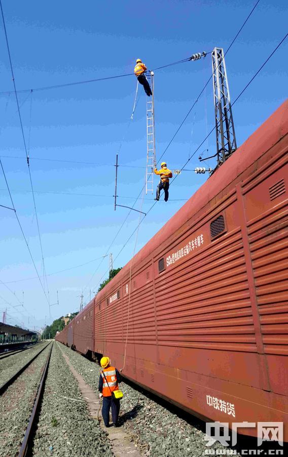 成都供電段宜賓接觸網(wǎng)檢修工區(qū)職工在宜賓站更換吊弦場景(央廣網(wǎng)發(fā) 駱峰 攝)
