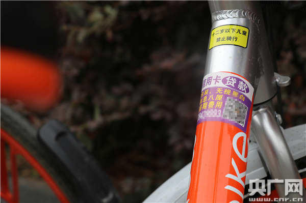 央廣網(wǎng)記者觀察到,這些小廣告的內(nèi)容多集中于二手房交易、租房售房、資金貸款、駕照收分等!芭Fぐ_”形狀大小不一,大多貼在車架前方,十分顯眼。由于粘性過大,記者幾次嘗試將其揭開,均以失敗告終。