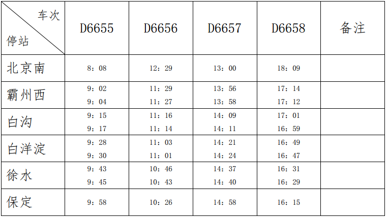 據(jù)悉,此次開行的2對動車組分別為:D6655/6次和D6657/8次,早午各一對,沿途?堪灾菸髡、白溝站、白洋淀站、徐水站,始發(fā)終到為北京南站和保定站,列車全程運行約1小時50分鐘。