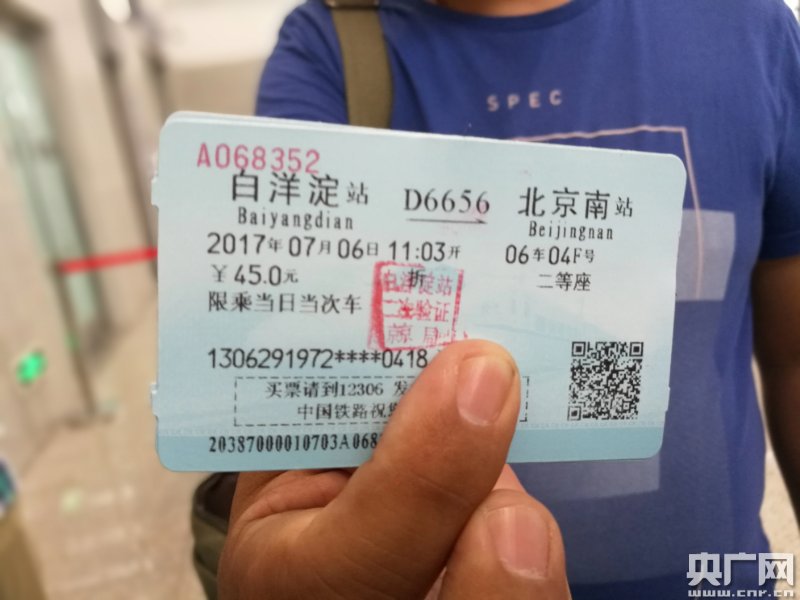 肖先生展示白洋淀到北京南車票(攝影宋駿)