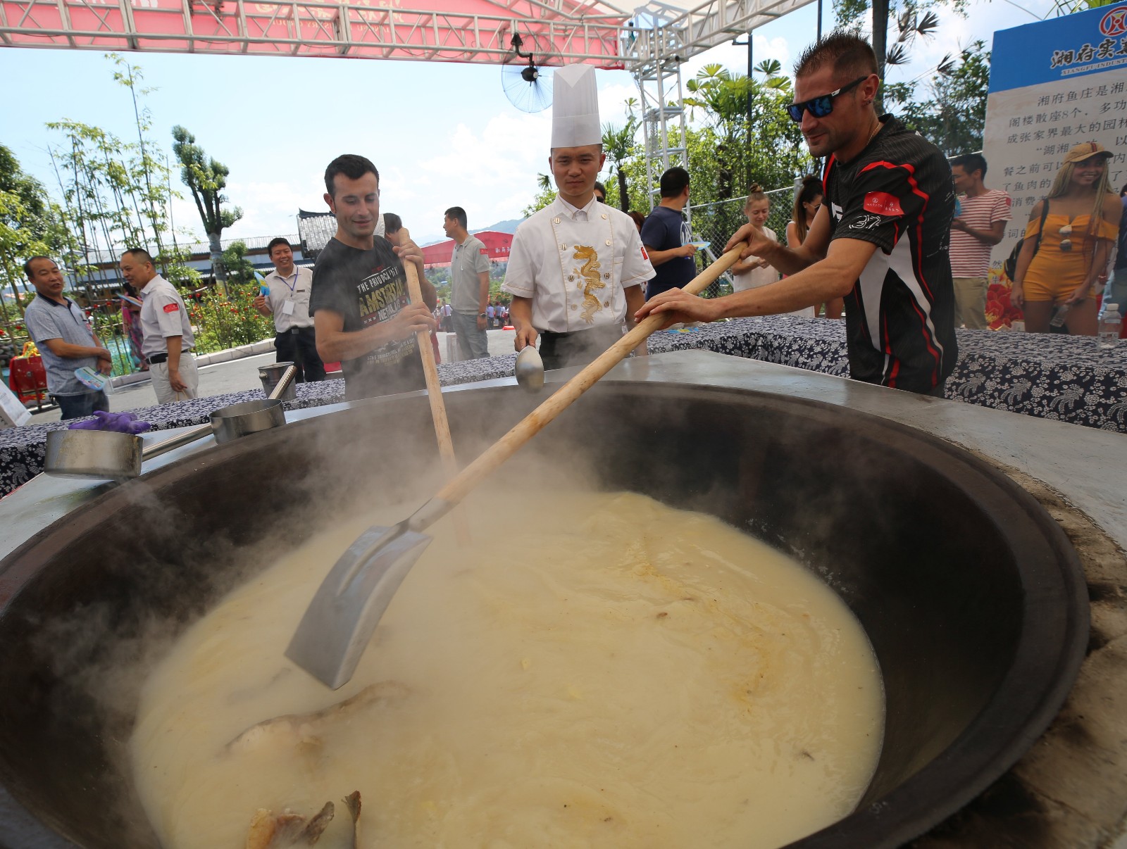 2017年7月17日,游人在湖南張家界市生態(tài)農(nóng)業(yè)休閑園湘府魚莊體驗大鍋煮魚的樂趣。