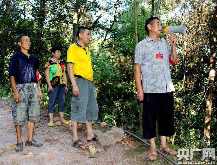 央廣網(wǎng)重慶7月28日消息(記者劉湛 通訊員侯祥 付道運(yùn))7月27日中午,火辣辣的太陽炙烤著大地,室外氣溫已超過40℃,在重慶市江津區(qū)蔡家鎮(zhèn)石佛村四組王家嵐埡山林里,四名護(hù)林人員還在巡山。他們其中一人手提高音喇叭,大聲宣讀江津區(qū)政府森林防火通告及森林防火注意事項(xiàng),其余三人精神高度集中,沿途四處觀察山林的每一個(gè)角落,高度警惕著山林火災(zāi)火警的發(fā)生。每個(gè)人臉上沁出了密密的汗珠,卻沒有一個(gè)人懈怠。