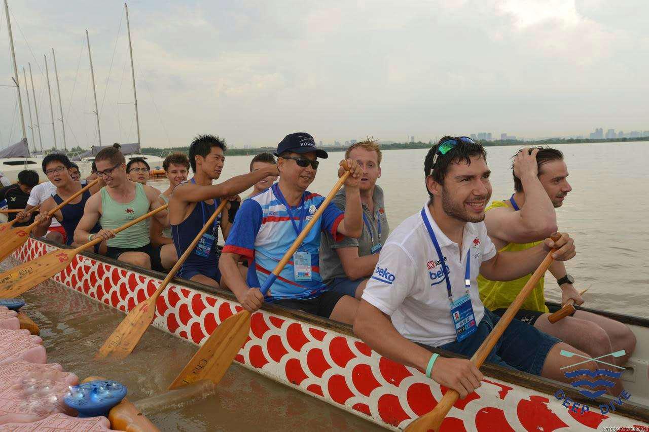 賽艇賽后是龍舟表演賽,以國內(nèi)賽隊(duì)為代表的大師隊(duì)和各國大學(xué)生云集的大學(xué)生隊(duì)進(jìn)行了現(xiàn)場(chǎng)龍舟競(jìng)技。隨著裁判發(fā)令槍響,原本平靜的江面立刻熱鬧起來,龍舟上的鼓手掄起兩個(gè)鼓槌同時(shí)猛擊大鼓,指揮著龍舟快速劃出起點(diǎn)。船槳同時(shí)切入水中,運(yùn)動(dòng)員們齊聲喊著號(hào)子,奮勇劃槳,動(dòng)作整齊劃一。飛濺的浪花,飛馳的龍舟,鼓聲、吶喊聲,與岸上的歡樂氣氛交相輝映,構(gòu)成了一幅千帆競(jìng)逐的畫面。