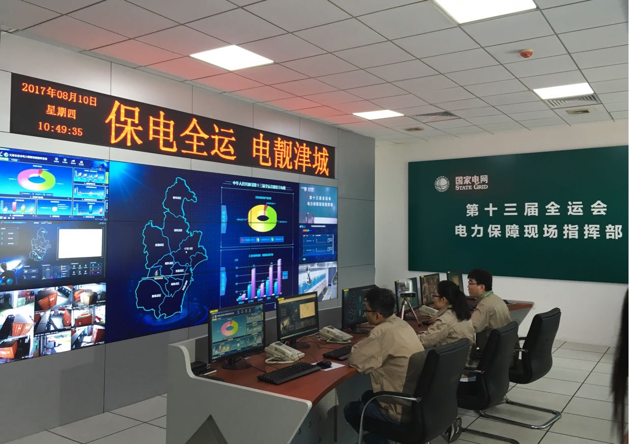 在奧林匹克中心體育場內(nèi)還有一支“網(wǎng)軍”,室內(nèi)一面墻上豎立著一塊大屏幕,標(biāo)示著:“天津全運會電力保障智能指揮平臺”。這個平臺基于地理信息背景,整合了生產(chǎn)管理信息、營銷業(yè)務(wù)、調(diào)度自動化系統(tǒng)等9個業(yè)務(wù)系統(tǒng),構(gòu)建了以實時監(jiān)控、應(yīng)急指揮、輔助分析為核心的可視化指揮平臺,為全運會電力保障指揮工作提供支撐。同時平臺通過“大數(shù)據(jù)+移動作業(yè)”手段,打造全景可視化保電模式,實現(xiàn)了全過程動態(tài)顯示和信息共享,使保電狀態(tài)處于全景可控在控狀態(tài)。