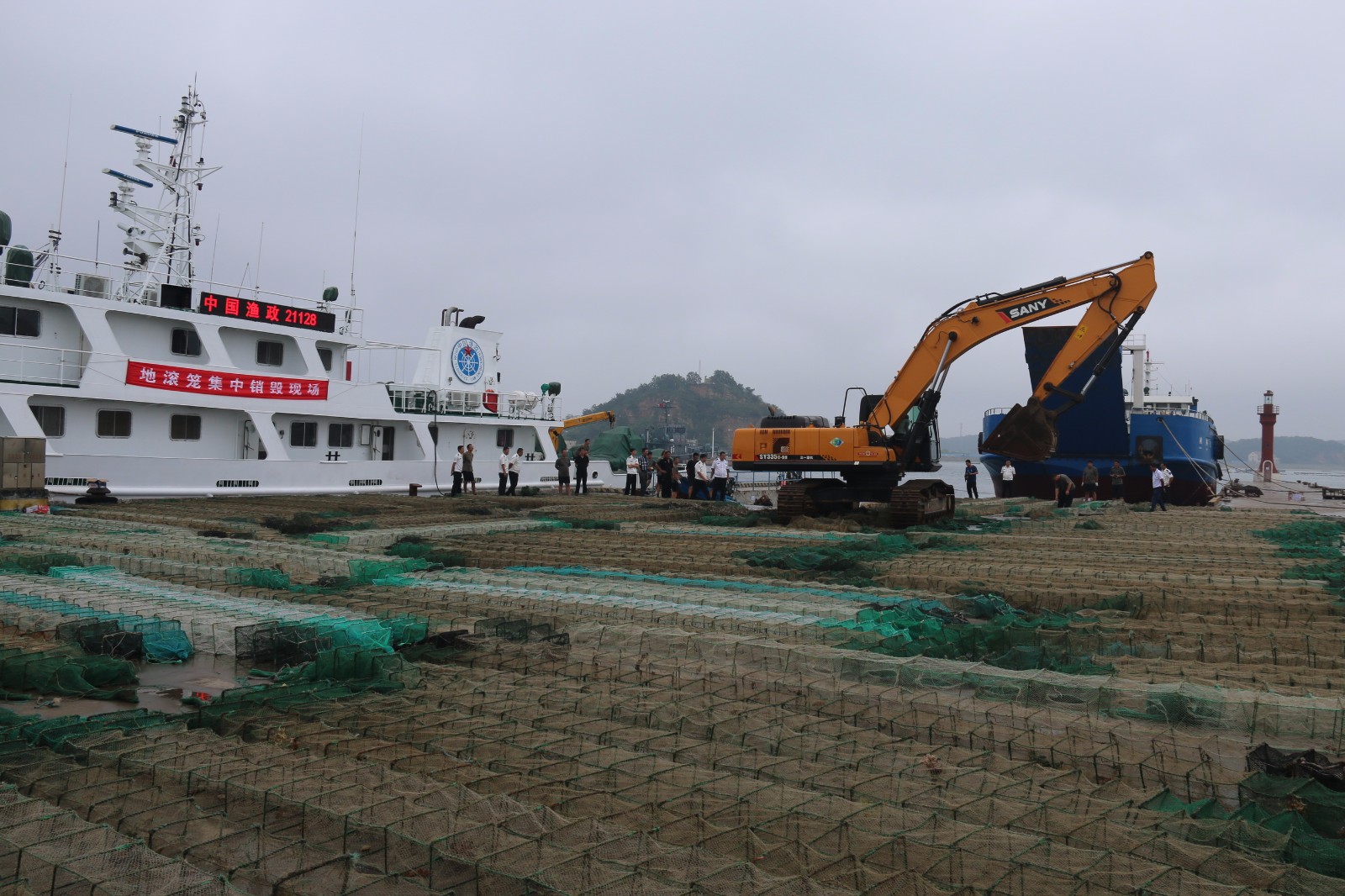 央廣網(wǎng)大連8月24日消息(記者田彤 張四清 通訊員楊淑革)記者昨天在遼寧省長?h大長山島鎮(zhèn)四塊石漁港看到,在漁政所工作人員的指揮下,一臺大型挖掘機(jī)正對依次排列的地滾籠進(jìn)行集中銷毀,價值10萬多元的1000個地滾籠瞬間變成廢品。為嚴(yán)厲打擊違規(guī)捕撈行為,保護(hù)海島近岸漁業(yè)資源,長海縣在全縣范圍內(nèi)再次開展地滾籠集中銷毀活動,現(xiàn)場一次性銷毀地滾籠3000余個,彰顯了海島清理和取締違規(guī)漁具的信心和決心。