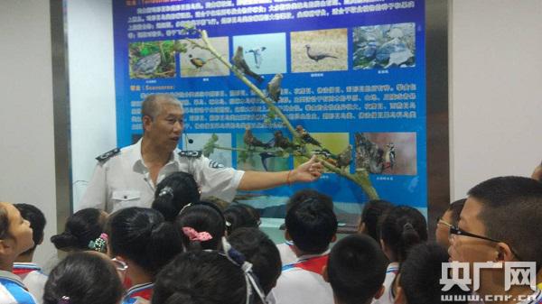 保護(hù)區(qū)管理局科研人員為參觀蛇島老鐵山自然博物館的小學(xué)生做講解。