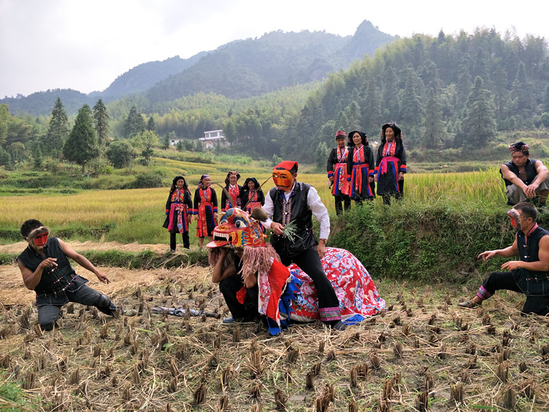 田間舞獅是瑤族同胞的一種傳統(tǒng)民俗活動,多在秋季收割稻谷時進(jìn)行。在收割完稻谷的田里,身著民族服裝的瑤族同胞歡聚一堂,頭戴猴像面具的瑤胞,引獅出場,伴隨歡快的鑼鼓聲,金猴盡使逗樂調(diào)侃手段,表演十分風(fēng)趣。猴子滑稽詼諧、輕靈乖巧的伴舞與獅子的端莊威武、凝重厚樸的表演形式形成鮮明的對比,給人以別具一格的視覺沖擊和心靈震撼。