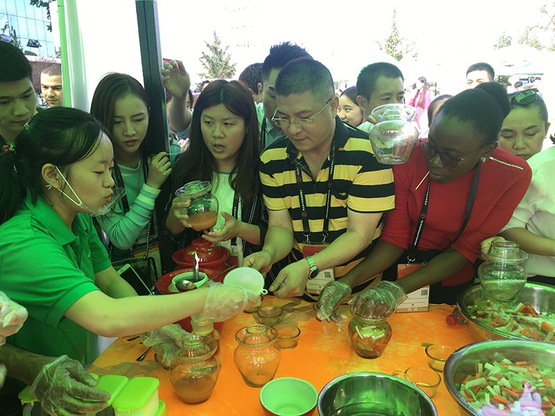央廣網(wǎng)成都9月28日消息(記者劉濤、眉山臺(tái)記者李佳倫、丁媛媛)9月28日下午,參加第九屆中國(guó)泡菜博覽會(huì)的15個(gè)國(guó)家的近60名外國(guó)友人和微商團(tuán)隊(duì),走進(jìn)眉山市東坡區(qū)吉香居和味聚特廠區(qū)參觀考察。眉山泡菜獨(dú)特的制作工藝和口味,深深吸引了這些外國(guó)友人。