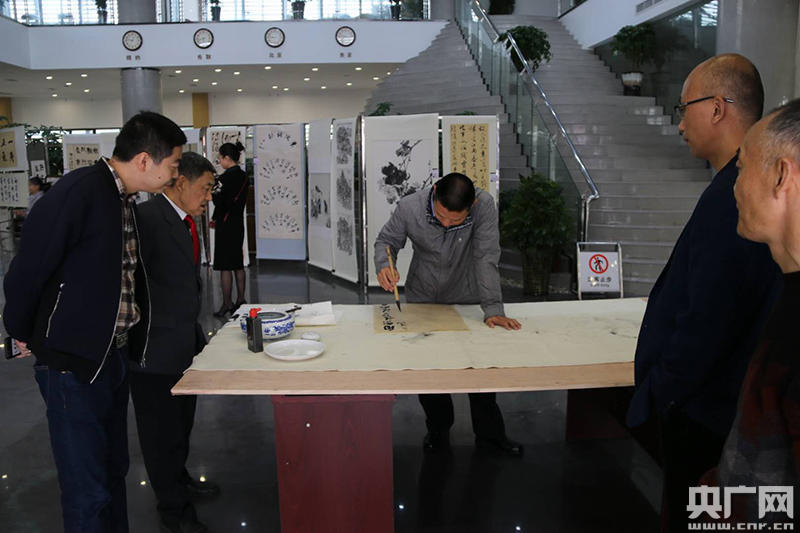 作為此次年齡最大的參展作者,今年82歲高齡的胡慶和喜愛(ài)書(shū)畫(huà)已經(jīng)有20年時(shí)間,他現(xiàn)場(chǎng)書(shū)寫(xiě)了一幅“厚德載物”的隸書(shū)作品。胡慶和認(rèn)為家鄉(xiāng)青神起了翻天覆地的變化,社會(huì)風(fēng)清氣正,生活美好心情舒暢,正是“勤、廉、德”的體現(xiàn)。