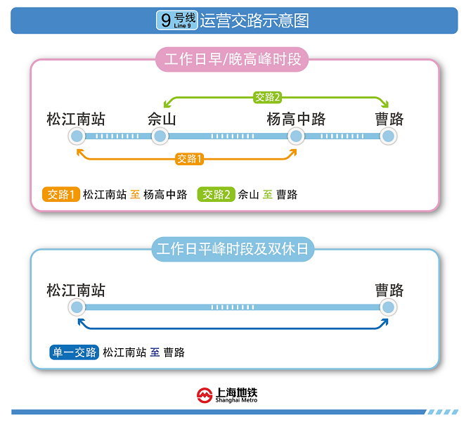 屆時(shí),工作日早晚高峰時(shí)段9號線列車開行雙交路,兩個(gè)交路分別為:松江南站站——楊高中路站,佘山站——曹路站;工作日平峰時(shí)段及雙休日、節(jié)假日,9號線全線開行單一交路,即:松江南站站——曹路站。