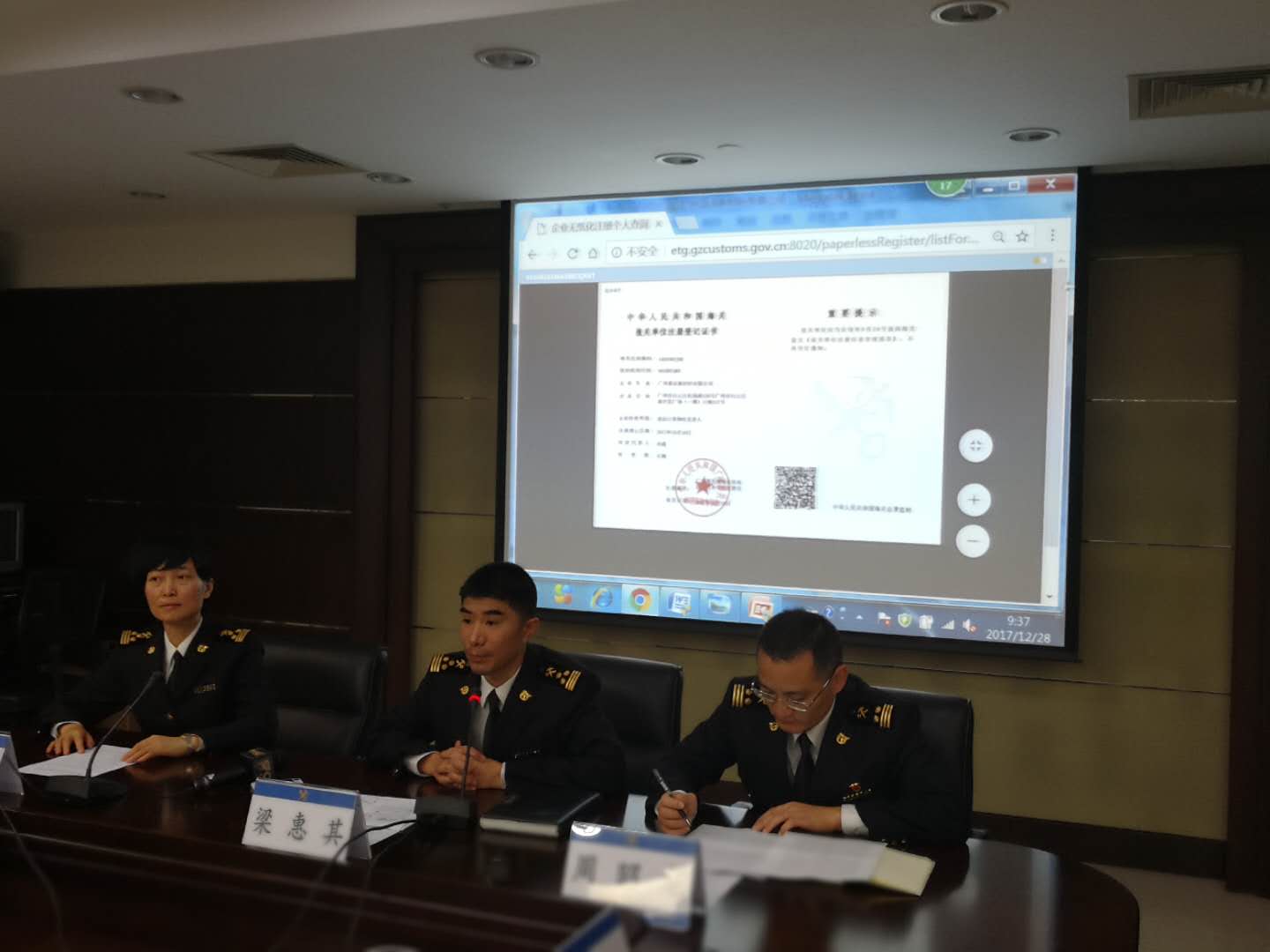央廣網(wǎng)廣州12月28日消息(記者鄭澍 通訊員關(guān)悅)廣州海關(guān)28日召開新聞發(fā)布會通報“先行先試”推進(jìn)企業(yè)注冊登記“無紙化”改革情況,廣州海關(guān)企業(yè)管理處處長梁惠其現(xiàn)場展示了全國第一張報關(guān)單位注冊登記的電子證書。從明年始,廣州海關(guān)將正式實(shí)施企業(yè)注冊登記“無紙化”,在全國率先推出全流程“無紙化”+“電子印章”服務(wù)。廣州海關(guān)通過“線上海關(guān)”系統(tǒng)對接廣州市商事主體信息平臺,實(shí)現(xiàn)企業(yè)信息數(shù)據(jù)的自動對碰,企業(yè)隨時隨地通過互聯(lián)網(wǎng)遠(yuǎn)程向廣州海關(guān)申請辦理海關(guān)注冊登記手續(xù),系統(tǒng)審核通過后會自動加蓋電子印章,企業(yè)可以在線領(lǐng)取電子版注冊證書并打印,也可到海關(guān)辦事窗口領(lǐng)取,或由海關(guān)通過免費(fèi)的郵政速遞寄達(dá)。