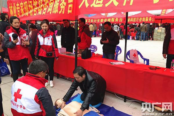 無(wú)人機(jī)展示、科技常識(shí)宣傳、為村民寫春聯(lián)、手把手教人工呼吸、演示如何正確使用滅火器材……當(dāng)天,永州市雙牌縣麻江鎮(zhèn)廖家村村級(jí)活動(dòng)中心人頭攢動(dòng),貼近民眾生活的科普貼畫、醫(yī)療義診、農(nóng)技展示等為當(dāng)?shù)卮迕袼蜕狭藴嘏按蠖Y包”,活動(dòng)現(xiàn)場(chǎng)熱鬧非凡。
