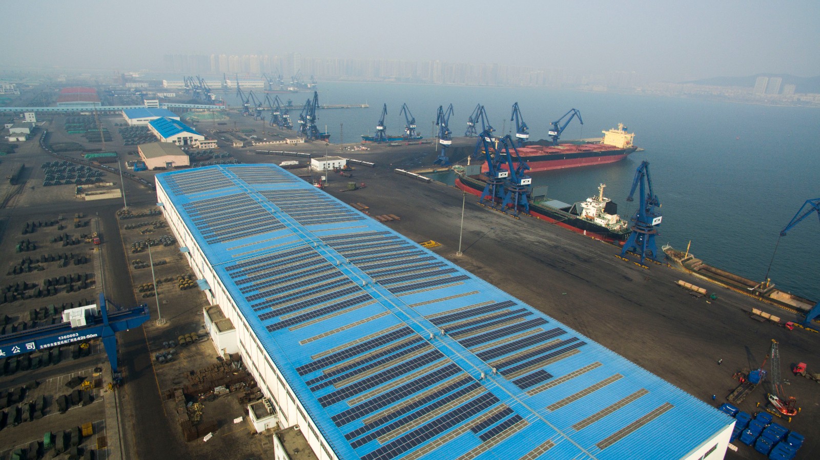 2016年,大連港集團根據(jù)大連灣港區(qū)的實際用電需求,利用散雜貨碼頭大連灣港區(qū)301庫、302庫屋頂空間(總面積約4萬平方米),建設(shè)分布式光伏發(fā)電項目。作為大連港綠色循環(huán)低碳港口建設(shè)的重要組成部分,該項目于2016年11月28日竣工,同年12月21日通過國家電網(wǎng)公司驗收,光伏發(fā)電正式與市電并網(wǎng)運行。