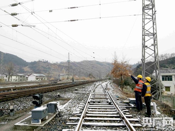 1月27日,成都供電段組織干部職工對此次降雪受影響區(qū)段接觸網(wǎng)關(guān)鍵設(shè)備進(jìn)行巡視。(李煒 攝)