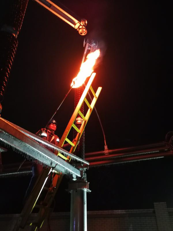由于220千伏關(guān)通線間隔融冰刀閘發(fā)生覆冰,影響直流融冰正常進(jìn)行。韶關(guān)供電局變電管理所檢修班高級(jí)技師張鐵林手持火把,登梯進(jìn)行動(dòng)火融冰操作,小心翼翼將刀閘觸頭上的覆冰慢慢烤化!案脖牡堕l觸頭不是導(dǎo)線,不通過(guò)電流,無(wú)法對(duì)其進(jìn)行直流融冰,所以我們選擇了動(dòng)火融冰方式!鄙仃P(guān)供電局生產(chǎn)技術(shù)部副主任易淑智介紹。