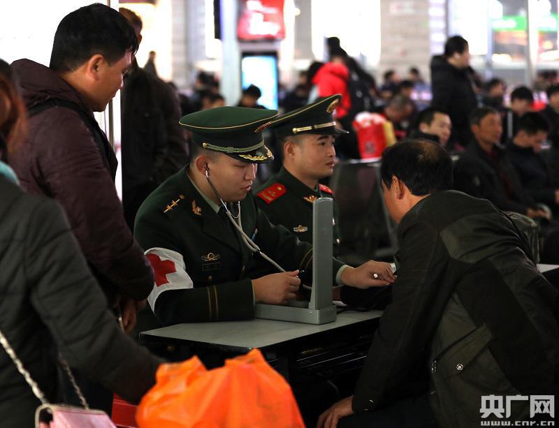 據了解,春運期間,執(zhí)勤官兵在維護正常秩序的同時,為旅客群眾辦實事、解難題,開展便民服務,車站后期將以流動醫(yī)療點為主,衛(wèi)生員隨巡邏官兵進行流動巡診,免費為需要幫助的旅客量血壓、發(fā)放應急藥品,受到了廣大旅客的普遍歡迎。