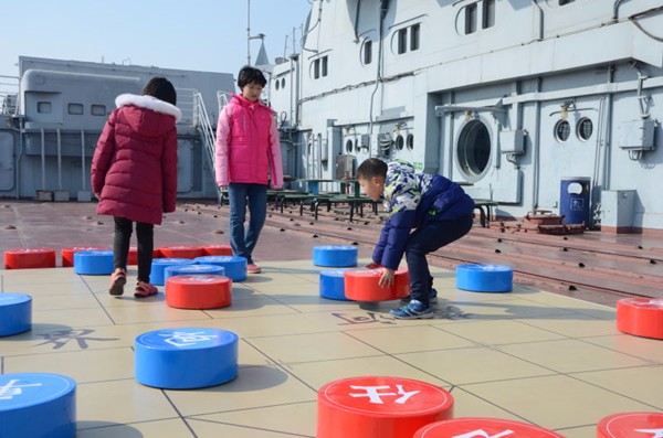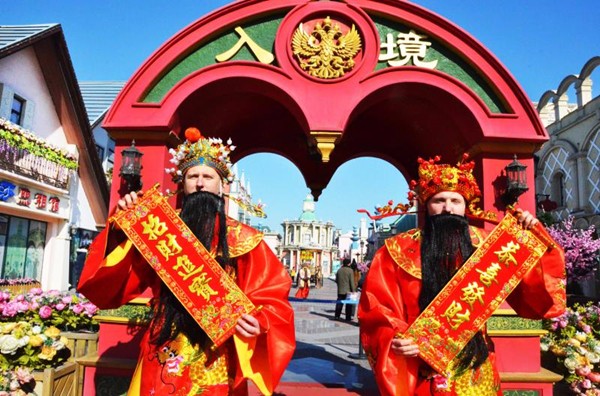 除了濃郁的軍事特色,中西合璧的混搭風(fēng)情也成為航母游的一大看點(diǎn)。公園工作人員介紹,今年公園推出的“洋”財神爺同樣聚集了不少人氣。俄羅斯姑娘和小伙在歡快的音樂伴奏下翩翩起舞,為游客們送上了獨(dú)特的新春祝福。