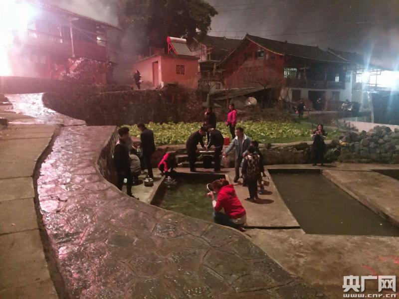 在大年三十夜子時“開財門”后,跨入新年的第一時間,歸蘭水族鄉(xiāng)水族同胞不論男女老少,都紛紛點著三柱香,拿著紙錢到井邊“敬井神”,拿著瓢,到水井邊排隊“吃新水”。