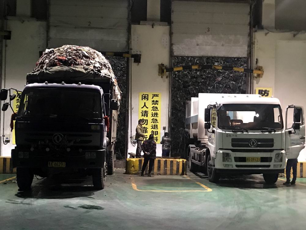 垃圾焚燒發(fā)電廠內(nèi),各地轉(zhuǎn)運(yùn)來(lái)的垃圾正在投入垃圾處理投料口
