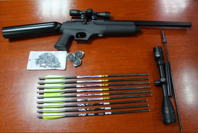 5月3日,深圳車(chē)站安檢員在火車(chē)站開(kāi)展安檢工作時(shí),發(fā)現(xiàn)一名男子攜帶的行李箱藏有可疑物品。安檢員要求其開(kāi)箱接受檢查,該男子卻神情緊張,拒不配合。安檢員立即向深圳鐵路公安處深圳車(chē)站派出所匯報(bào)。獲悉情況后,派出所迅速通知附近民警趕赴現(xiàn)場(chǎng)處置。民警詢問(wèn)該男子行李箱內(nèi)有什么物品,該男子支支吾吾,答非所問(wèn)。民警加強(qiáng)警戒,打開(kāi)該男子攜帶行李箱一看,發(fā)現(xiàn)里面居然有分解存放的氣步槍1支,8倍及4倍放大鏡瞄準(zhǔn)器各1個(gè),彈夾3個(gè),金屬?gòu)椫?51顆,箭9支。