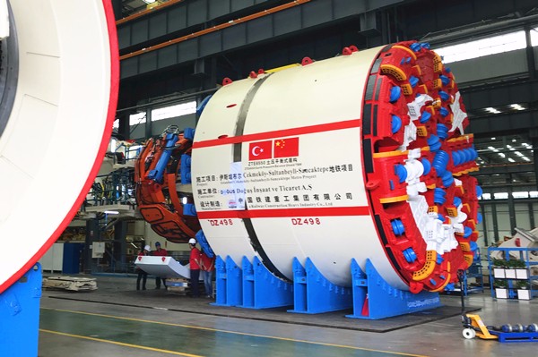 在園區(qū)現(xiàn)場,擁有“三頭六臂”的智能型鑿巖臺(tái)車和混凝土噴射臺(tái)車、多功能作業(yè)臺(tái)車等鉆爆法隧道施工裝備正在有序生產(chǎn);被譽(yù)為“地下航空母艦”的全斷面隧道掘進(jìn)機(jī)有5臺(tái)產(chǎn)品在同時(shí)進(jìn)行裝配,其中1臺(tái)將參與土耳其伊斯塔布爾地鐵建設(shè)的盾構(gòu)機(jī)進(jìn)入驗(yàn)收階段,這是我國首臺(tái)“自駕出!钡綒W洲的國產(chǎn)品牌盾構(gòu)機(jī)。