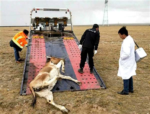 民警到達(dá)現(xiàn)場后,看見一只體型較為龐大、全身有紅棕色皮毛、似驢又像馬的動(dòng)物躺在黃草灘上,并且動(dòng)不了,但有明顯生命跡象。經(jīng)初步鑒定為國家一級保護(hù)動(dòng)物西藏野驢,由于頸部被撞傷,不能站立。民警在確定傷情后,制定救助方案,雇用板車將其運(yùn)回距離現(xiàn)場480公里外格爾木市野生動(dòng)物救助站進(jìn)行救治。
